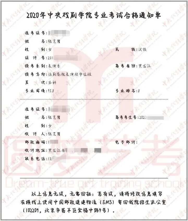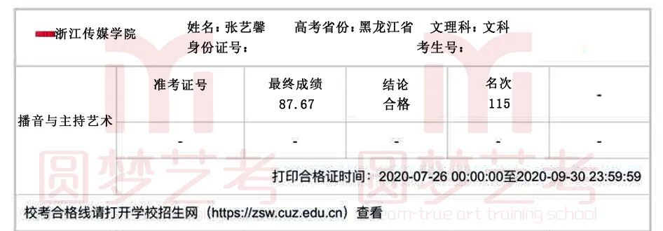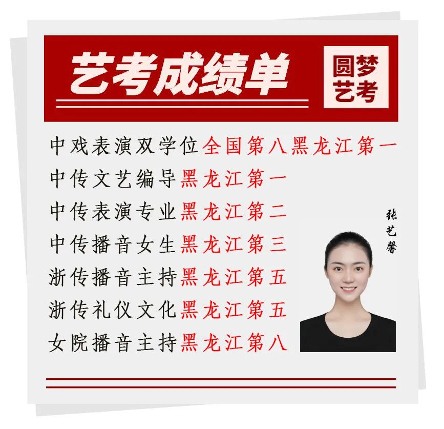 2020年艺考,张艺馨取得了优异的成绩。中传播编表三证齐收,浙传播本礼仪双证在手,中戏表演双学位全国第八名,女院播音主持全省第八名。