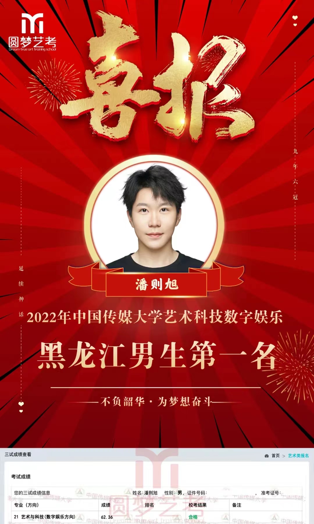 潘则旭 22年中国传媒大学艺术科技数字娱乐 黑龙江男生第一名