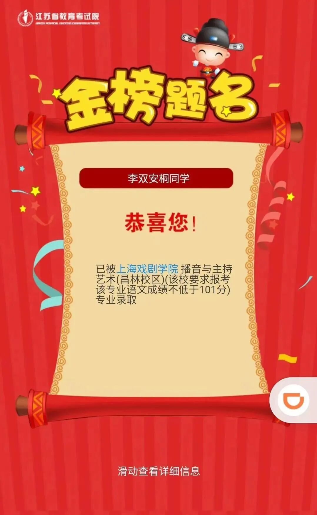除了获上戏、浙传、中传的青睐,李双安桐还收获了南艺、南传、苏州大学、河海大学、南京师范、江苏师范等多所名校合格证!下证率已然达到“收割机”级别!